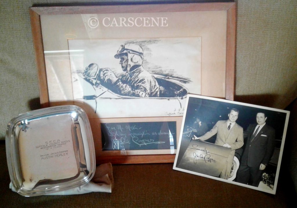 Jackie took delivery of one of the first Austin Healey 100s to arrive in the U.S. in 1953. It was used for both daily commuting and racing which was not unusual in those days. He was particularly successful in SCCA races held on circuits in the North East of the United States. It was his ‘class’ win in one such race at Suffolk County Airforce Base, NY. in 1954, that is celebrated in this photo of Melton family artefacts. The photo shown in the collection features ‘Mick’ Melton together with Jackie Cooper.